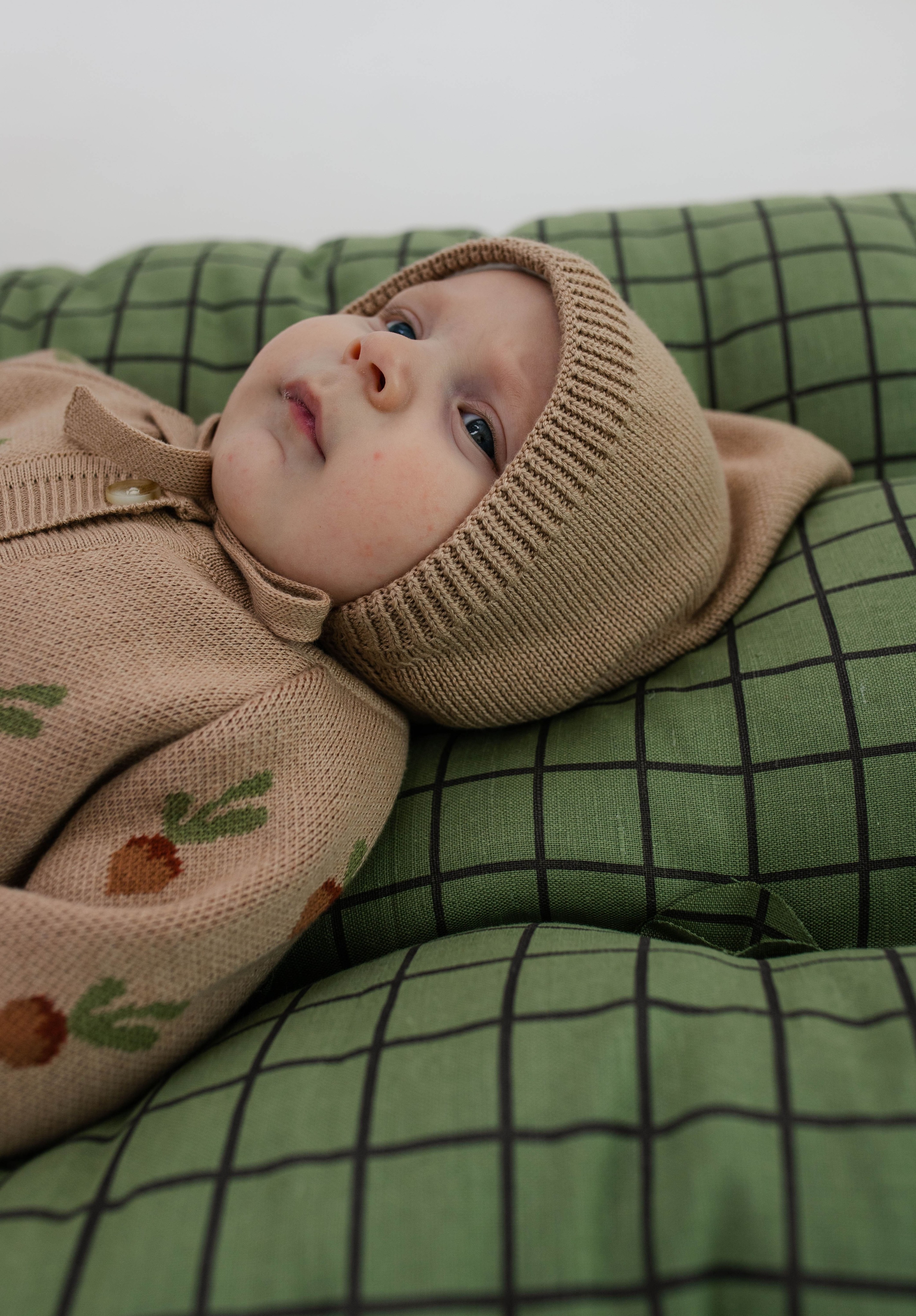 Шапочка выполнена с хлопковым подкладом, подходит ко всем нашим моделям вязаных комбинезонов.